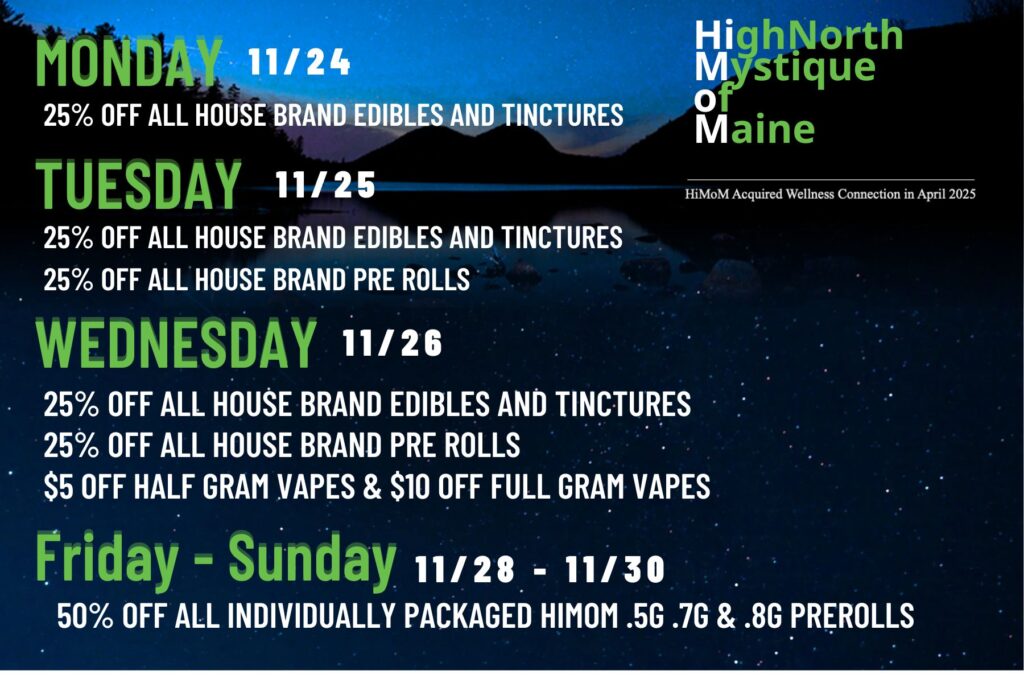 Green Wednesday in ME is a unique opportunity for cannabis consumers to save big ahead of the holiday season. As one of the largest shopping days in the cannabis industry, this event is designed to give you access to premium cannabis products at a fraction of the price.